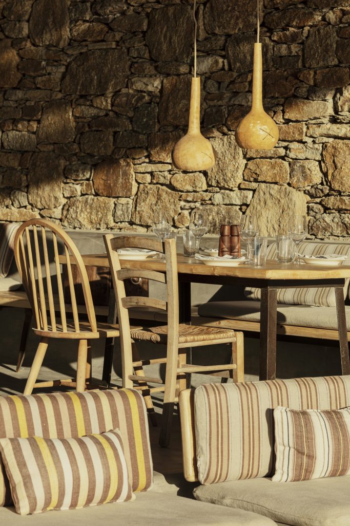 Cycladic elements, such as whitewashed textures and dry-stone walls,